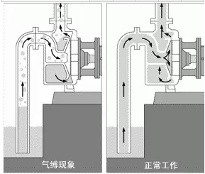 離心泵在啟動前沒有灌滿被輸送的液體,或者是在運轉過程中泵內滲入了空氣,因為氣體的密度小于液體的密度,產生的離心力小,無法把空氣甩出去,泵殼內的流體在隨電機作離心運動產生負壓不足以吸入液體至泵殼內,泵象被“氣體”縛住一樣,失去了自吸能力而無法輸送液體,稱作離心泵的氣縛現象。