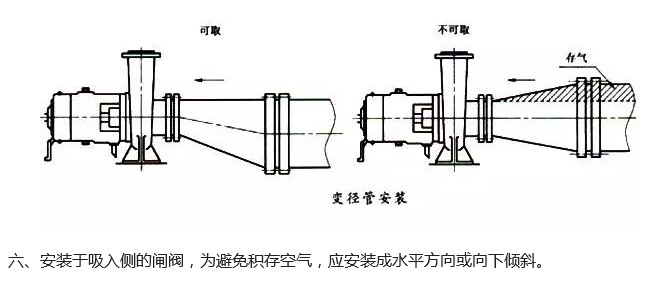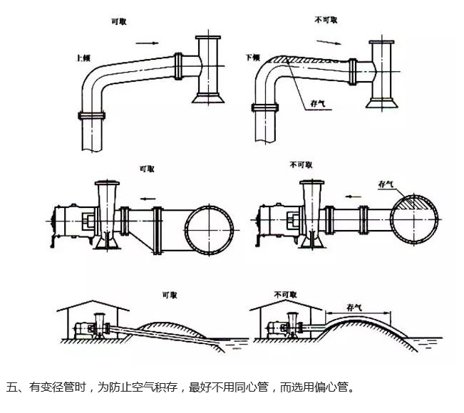 泵出口管道卜的異徑管府靠近泵的出口。頂部吸人和排出的泵,在間距很小時(shí),可采用偏心異徑管加大間距。