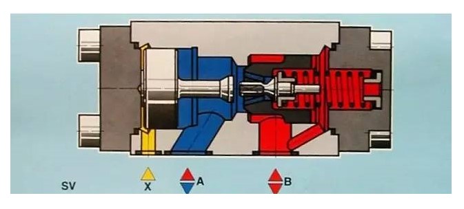 在某些場合,需要單向閥允許油流反向通過,這時即采用液控式單向閥。液控式單向閥結構和符號如圖5—2所示。它主要由直角單向閥和控制活塞兩部分組成。當下蓋7上的控制油口元壓力油時,它僅是一個普通單向閥,只允許油液從A流向B;當控制油口通人壓力油時,則控制活塞就被頂起,通過頂桿使閥芯1強制打開,允許油液由B向A反向流過。