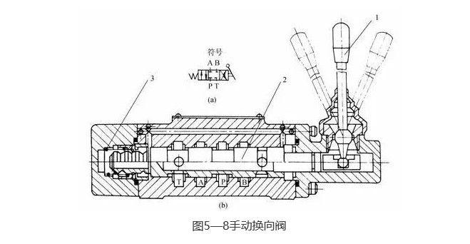 圖5-8(b)為自動復位式手動換向閥,放開手柄1、閥芯2在彈簧3的作用下自動回復中位,該閥適用于動作頻繁、工作持續時間短的場合,操作比較完全,常用于工程機械的液壓傳動系統中。