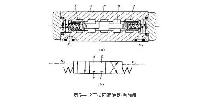 圖5-12所示為液動換向閥的結構圖和圖形符號圖。當控制油口K1、K2均無控制壓力油通入時,閥芯在兩端彈簧作用下處于中位(圖示位置);當K1通入控制壓力油、K2通回油時,閥芯在液壓力作用下克服右端彈簧力移向右端;反之,當K2通控制壓力油、K1通回油時,閥芯被推向左端,從而實現了油路的換向。