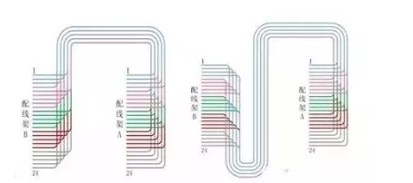 根據(jù)圖示,在A配線架上雙絞線的排列為1號線先出現(xiàn),其他線按順序出線,排列整齊;在B配線架上為24號線先出線,改為了下出線方式,由于上層的線全部覆蓋在所有的線上,保持了一層完全平整的斜線,所以在B配線架上依舊美觀。