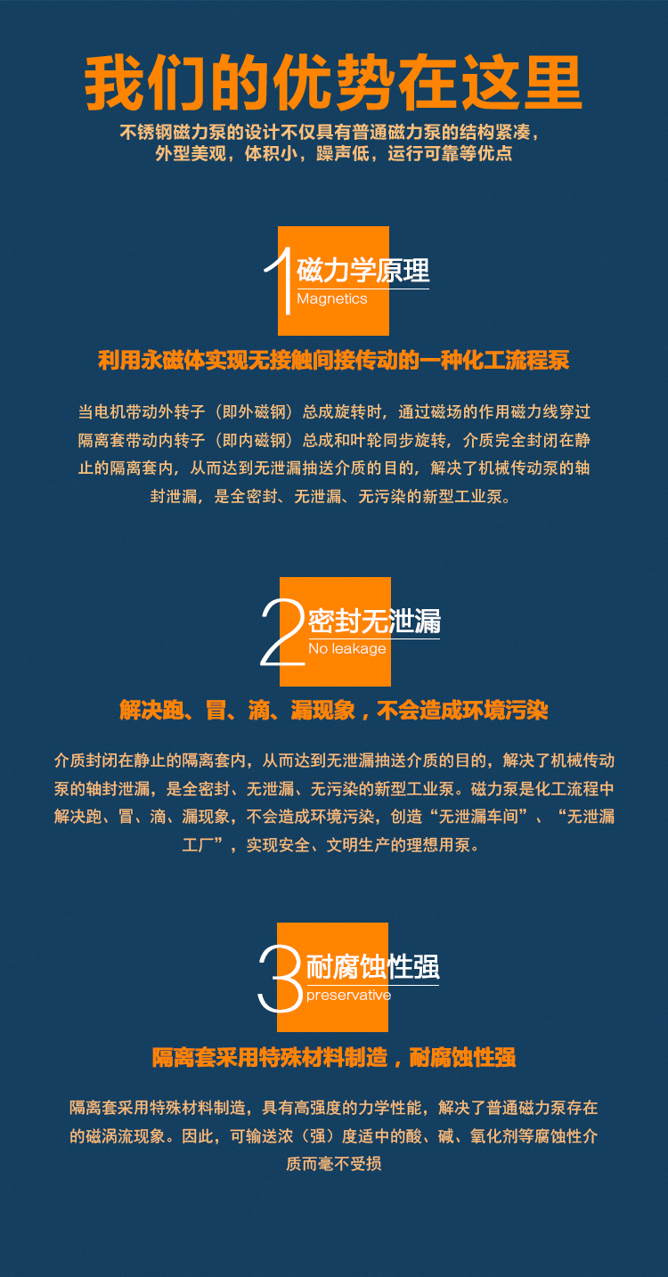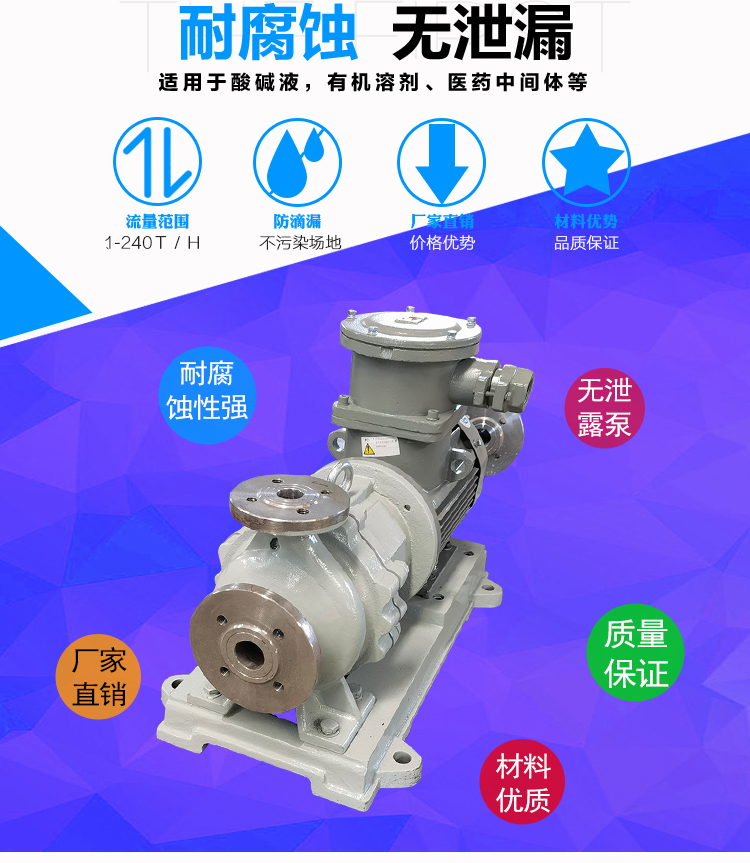 WJC不銹鋼磁力泵過流部件采用全不銹鋼材料(304、316、316L),內、外磁轉子選用高磁能積、高矯頑力的稀土永磁制造,具有高效節能、介質適用面廣、耐高溫、磁性強、不退磁等優點,對有機酸,有機化合物,堿,中性溶液和各種氣體都有良好的耐蝕性,雙螺旋糟碳石墨軸承和硬質合金軸套,具有較強的耐磨性,是應用磁力耦合實現無接觸傳動、無動密封的新型高品質磁力化工泵。保證了產品的壽命,是無泄漏輸送腐蝕性介質的理想用泵。