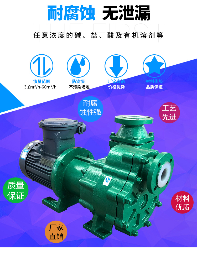 ZMD氟塑料磁力自吸泵又稱其為氟塑料自吸磁力泵、襯氟磁力自吸泵、耐腐蝕自吸化工泵,ZMD襯氟磁力自吸泵具有磁力泵和自吸泵的特性,同時兼具良好的自吸功能。按照國標設計研發可以輸送低位介質、罐車原料裝卸、氣液混合介質。過流部件緊襯氟塑料,泵體為金屬材料,能夠承受管道重量。取消軸封,利用磁力間耦合驅動,不會滴漏現象,保障工況安全生產。