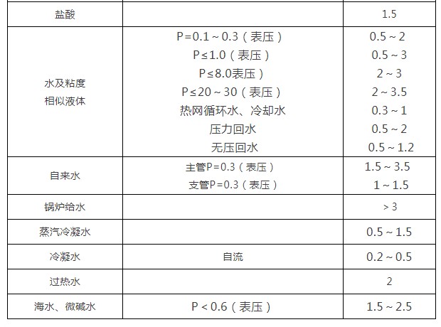 2、各種介質常用流速一覽表