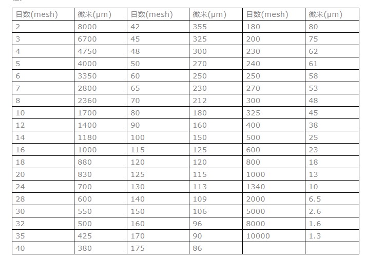 計(jì)量單位目粒度是指原料顆粒的尺寸,一般以顆粒的大長度來表示。網(wǎng)目是表示標(biāo)準(zhǔn)篩的篩孔尺寸的大小。在泰勒標(biāo)準(zhǔn)篩中,所謂網(wǎng)目就是2.54厘米(1英寸)長度中的篩孔數(shù)目,并簡稱為目。