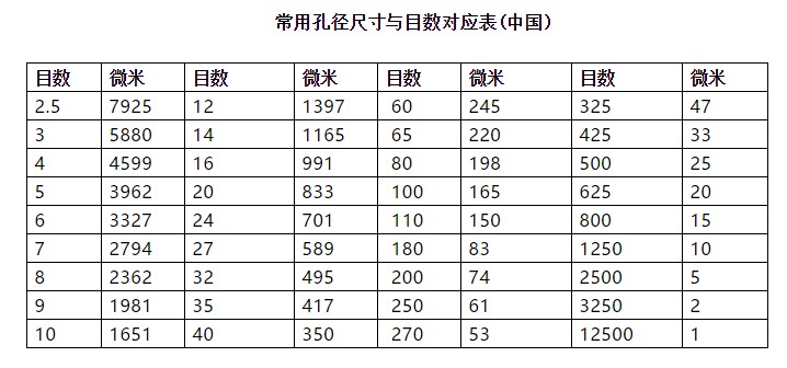 目數(shù),就是孔數(shù),就是每平方英寸上的孔數(shù)目。目數(shù)越大,孔徑越小。一般來(lái)說(shuō),目數(shù)×孔徑(微米數(shù))=15000。比如,400目的篩網(wǎng)的孔徑為38微米左右;500目的篩網(wǎng)的孔徑是30微米左右。